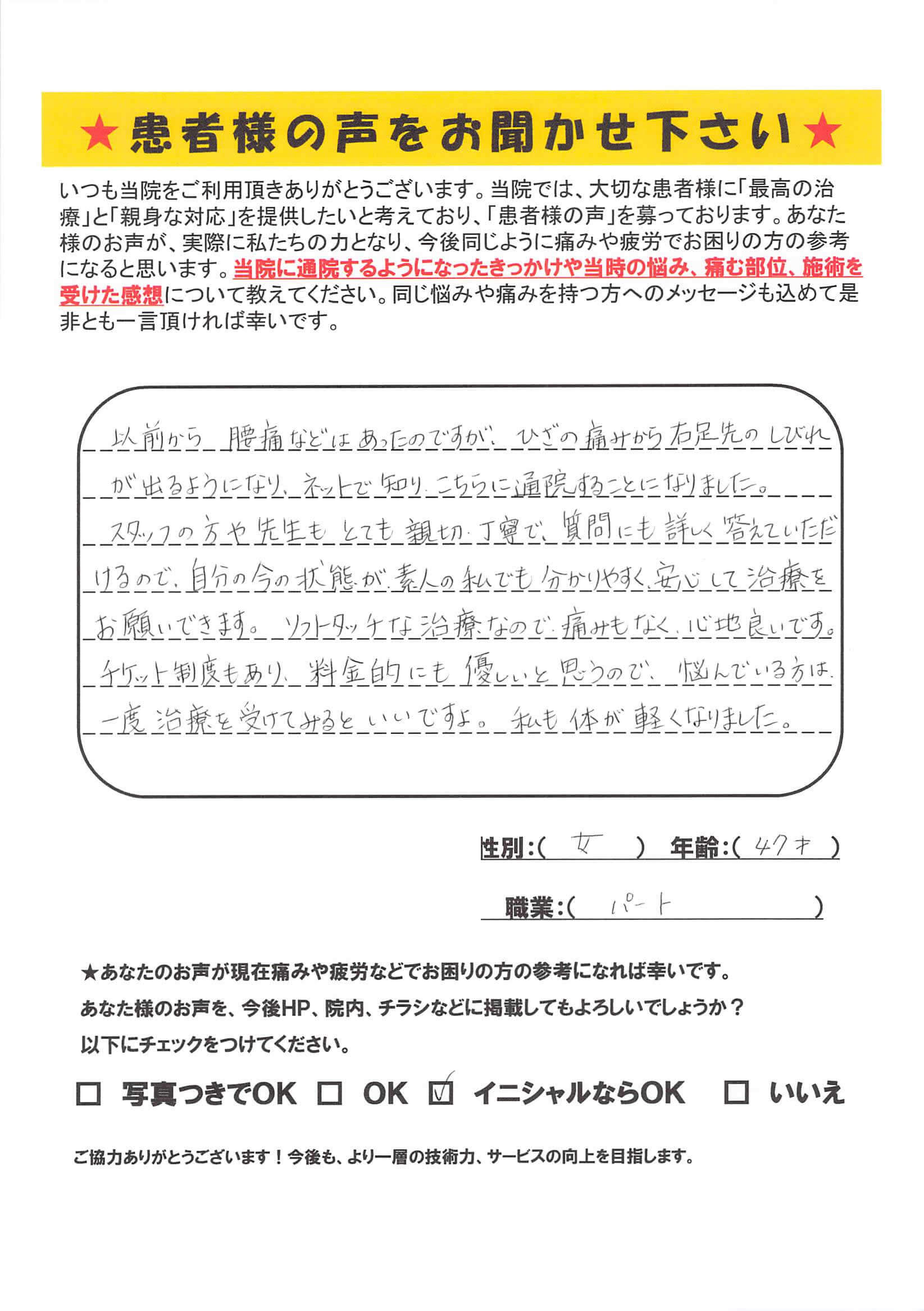 以前から腰痛などはあったのですが、ひざの痛みから右足先のしびれが出るようになり、ネットで知り、こちらに通院することになりました。