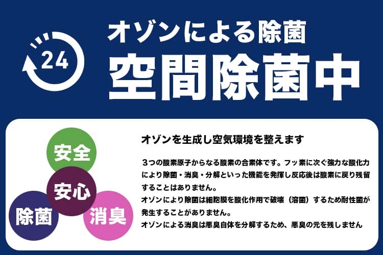 オゾンは空気中の浮遊ウイルスだけでなくテーブルやドアノブなどに付着したウイルスも不活性化させ、室内空間を徹底的に清潔にします。